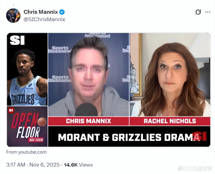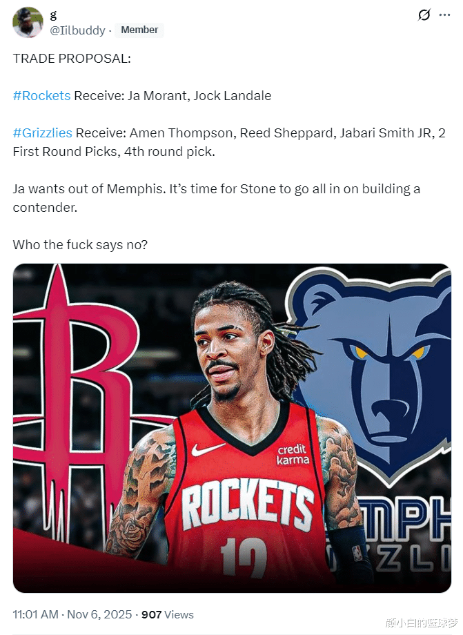 On November 6, the Grizzlies lost 109-124 to the Rockets and suffered their fourth consecutive defeat. Morant's personal performance in this game was still very poor. The conflicts between him and the coaching staff/management clearly affected his competitive state, and he was deeply involved in trade rumors. Before the game, NBA reporter Sam Amick revealed that the Timberwolves are paying close attention to Morant's movements, and Sacramento is also paying attention to Morant. SI reporter Chris Mannix then reported that the Grizzlies are undoubtedly rebuilding, and they still regard Morant and Jaren Jr. as the cornerstones of the team. However, the odds of Morant's next club are still out, because the conflict between Morant and the coaching staff and management has been made clear. Morant was dissatisfied with the management's firing of Jenkins last year. He was even more dissatisfied with the team model + ice hockey rotation of new coach Isalo, which caused his possession of the ball to drop significantly. He publicly accused the coaching staff and was suspended for one game. After the first half, Morant made 2 of 7 + 1 of 4 three-pointers and scored 7 points, 5 assists and 2 rebounds; Jaren Jr. made 0 of 1 in the half and scored 0 points. The performance of these two cores was helpless. In the third quarter, Morant made 2 of 6 + 1 of 0 three-pointers, 6 points and 2 rebounds. After three quarters, Morant scored 13 points, 6 assists, 4 rebounds, 1 steal, 1 block and 6 turnovers. After three quarters, he scored 13 points, 4 of 13 + 1 of 5 three-pointers. In the final quarter, Morant made 2 of 6 + 0 of 2 three-pointers, scoring 4 points, 2 assists, and 1 rebound. He made 6 of 19 in the game, 1 of 7 three-pointers, 17 points, 8 assists, 5 rebounds, 1 steal, 1 block, and 6 turnovers. He shot 31.6% from the field and 14.3% from the three-point range. In Morant's recent three games, he made 14 of 3+ three-pointers, 6 of 0+6 turnovers, 16 of 5+ three-pointers, 4 of 0+5 turnovers, 19 of 6+ three-pointers, and 7 of 1+1 turnovers, for a total of 49 of 14+12 turnovers. This was also Morant's performance after the conflict with the coaching staff. When the Rockets were playing against the Grizzlies, a Grizzlies fan hoped that the Rockets would trade Amen, Shepard, Jamal, 2 first-round picks, and 4 second-round picks for Morant and Landale. Many Rockets fans in the comment area criticized him verbally. Do the Rockets still need Morant after winning five games in a row? Morant's off-court incidents continue.