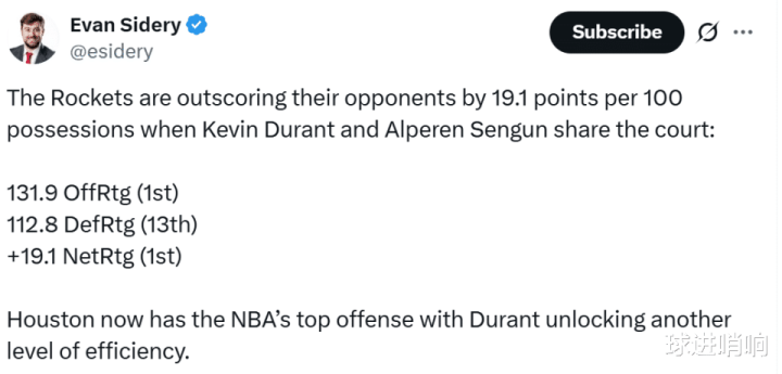 The Rockets' offensive efficiency soars to the top of the league! Who is the biggest beneficiary of the 8-for-1 trade to acquire Durant from Houston? Two reasons prove that one person is happier than Shen Jing. The Rockets' offense soared and ranked first Since Udoka took over the Rockets two years ago, defense has always been the biggest label of the young Rockets. Last season, they returned to the playoffs as the second seed in the Western Conference with their top-five defensive performance in the league. In sharp contrast is the team's poor offensive performance in positional warfare. With top-level defensive counterattack resources and a massive secondary attack brought by their absolute advantage in offensive rebounds, the Rockets can only deliver a mid-range offensive performance in the league. As a result, so far in the new season, the Rockets, who lack core point guard Van Jordan, are still delivering amazing performances on the offensive end. According to the statistics of the US media "Kalshi Sports", the Rockets' offensive efficiency of 125.2 (score per 100 possessions, the higher the better) since the start of the game has surpassed the 76ers to rank first in the league. At the same time, the net efficiency value of +9.2 (net rating per 100 possessions, the higher the better) ranks fourth in the league. Durant's joining is undoubtedly the core reason why the Rockets have greatly improved on the offensive end. Especially when he and Shen Jing are on the court at the same time, the Rockets, with two offensive cores inside and outside, have significantly improved their offensive choices and performance. Meiji Evan Sidery also pointed out this through specific data. Since the start of the game, when Durant and Shen Jing are on the court at the same time, the Rockets' offensive efficiency will further soar to 131.9, ranking first. At the same time, the defensive efficiency also improved to 112.8, which ranked 13th in the league, and the net efficiency also reached +19.1, which ranked first in the league. One person is happier than Shen Jing It is not difficult to see from the data that Shen Jing is obviously one of the biggest beneficiaries after Durant joined. Compared with his former partner Jaylen Green, after joining forces with Durant, Shen Jing faces significantly less pressure on the offensive end. Since the beginning of the season, he has averaged 23.8 points, 8 rebounds, 7.2 assists and 2 steals per game, shooting 57% from three-point range, and averaging 2 three-pointers per game. Except for rebounds, all other statistics are career highs. But Shen Jing is not the biggest beneficiary of the Rockets' 8-for-1 exchange of Durant. The American media "clutchpoints" revealed two reasons that Jia is the biggest beneficiary of Durant's joining. Reason 1: Better shooting space Since the Rockets' offensive space has always been very poor, Jia Jia, as one of the team's few high-volume space points, had to face huge defensive pressure. After Durant joined, this point improved significantly. Even though Durant has only averaged the second-lowest 17 shots per game in his career since the start of the season, with the first lowest being in his first season with the Warriors, he has brought the same strong offensive threat and attraction to the team as when he joined the Warriors, and continues to create open shots for his teammates. Just as Jia Jia said against the Raptors: "One moment I partnered with Durant, and the next moment I appeared next to Shen Jing. The opponent had to choose 1 of 2 and double-team them. This will happen throughout the season." In this game, Jia also played the best game of his career next to Durant and Shen Jing, scoring at least 25+5+5 in a single game for the first time in his career. So far since the beginning of the season, despite obviously poor shot selection, Xiao Jia has still averaged a career-high 15.8 points per game and a 37% three-point shooting rate. He averages 6.8 three-pointers per game and 2.5 three-pointers, both career highs. Reason 2: The perfect role model Durant is a perfect role model for Jia on both offense and defense. The two have been training together during the offseason of the past three seasons, and this continues to be the case after Durant joined the Rockets. Considering that the two have similar body types and both have outside shooting abilities, Durant will undoubtedly play a mentor role in Jia's growth process. Jia made no secret of this in an interview with the local media "Space City Home Network" in Houston. He said frankly that Durant is a selfless teammate and a good role model, and he is happy to learn from him. It can also be seen from the ranking of average touches per game compiled by Meji Bradeaux from the beginning of the season to the present, why Jia is the biggest beneficiary after Durant joined. Since the start of the season, Xiao Jia has averaged 23.5 touches per game, a significant increase compared to last season, successfully tying Amen and tying for third place with the Rockets, second only to Durant 37.5 times and Shen Jing 42 times.