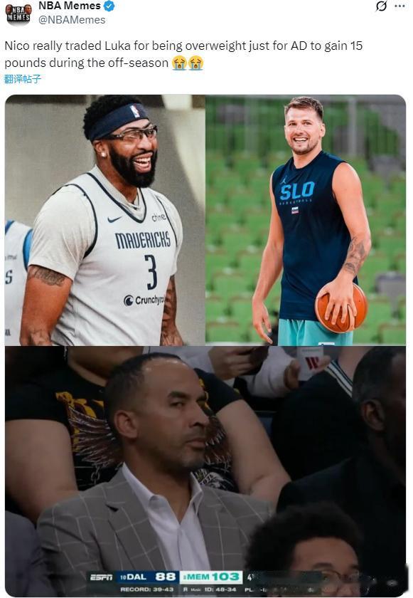 On October 2, according to US media reports, Mavericks star Anthony Davis has gained 15 pounds (about 6.8 kilograms) since last season, and Thick Brows has gained a lot of weight. Thick Brows responded that he was not worried at all. He gained weight to prevent weight loss in the middle of the season and caused his body to be thin. He also revealed that he had lost 5 pounds through training camp. At present, the official weight of Thick Eyebrow has reached 268 pounds (about 121 kg). The team registered for it last season was 253 pounds (about 115 kg), which is 15 pounds heavier than last year. Thick Eyebrow gains have caused heated discussions. Fans joked that others are working hard to lose weight, and there is no one else in your reverse operation. Some fans are also worried that Thick Eyebrow gains will increase the risk of injury. US media NBA Memes posted a photo of the Mavericks' general manager with Davis and Doncic, writing: Nico Harrison really traded Doncic because he was overweight, and Davis gained 15 pounds. It is worth mentioning that Doncic currently weighs 230 pounds (104.3 kg), and his weight reached 270 pounds (122.5 kg) last season; this year's offseason, Doncic successfully lost weight and lost weight, and obviously lost a lot of weight. However, Thick Eyebrow was not worried at all about gaining weight, and he said: I feel very good. Basically I was in a similar state before the start of each season, because I gained a lot of weight throughout the summer, and by November I usually reach 255 pounds (about 116 kg) and 258 pounds (about 117 kg). I never enter the season with my game weight, otherwise I will look too thin after losing weight during the season. continued: I can lose 10-12 pounds (about 4.5-5.4 kg) in a short while. During training camp alone, I had lost 5 pounds (about 2.3 kg) through a lot of running and confrontation. So I never worry about this. Now the body is in great shape, the movement is flexible, and the feeling is very good. Currently, Thani Brow is leading the team to actively prepare for the game. Since undergoing retinal detachment surgery during the offseason, Thani Brow revealed that according to the doctor's request, he will wear goggles for the rest of his career to participate in the competition. Last season, Untaby's played 9 regular season games for the Mavericks, averaging 29.6 minutes per game and scored 20 points, 10.1 rebounds, 4.4 assists and 2.2 blocks. What kind of performance can Untaby's lead the team in the new season? Let's wait and see.