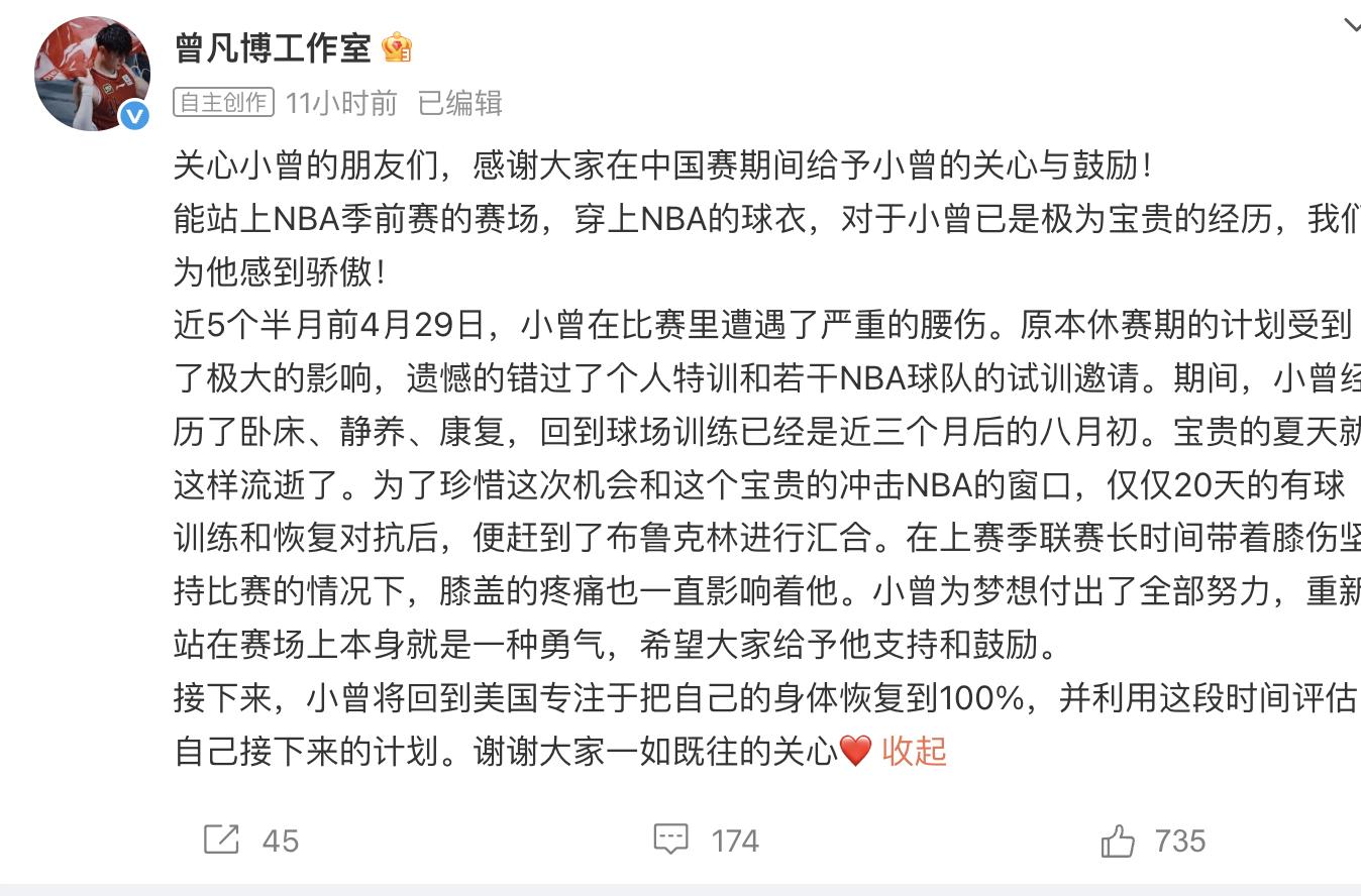 After the two NBA China games, the Nets suddenly announced on social platforms a piece of news that was difficult for many fans to accept, that is, Zeng Fanbo, who announced that he had joined the Nets some time ago, had been waived by the team. This means that for Zeng Fanbo, there are only two options left. Either choose to play in the Development League and upgrade and fight monsters, or choose to return to China and continue competing in the CBA League. After the news of the layoff came out, many Chinese fans were very angry for a while because they felt that the Nets were too unjust. First of all, in the previous two games in China, Zeng Fanbo hardly got many opportunities to perform and play. On the other hand, Zeng Fanbo was laid off just after the game. The intention should not be too obvious. I believe it should be quite sad for the player himself. However, as the controversy over the layoff fermented, Zeng Fanbo's studio has also revealed the inside story on social platforms. We just learned that the team cannot be blamed for Zeng Fanbo being laid off this time. First of all, to be honest, judging from the performance of the first China game, Zeng Fanbo was extremely nervous, and his overall ability and rhythm did not match that of his other teammates. He was obviously half a beat behind. In addition, the studio also admitted that Zeng Fanbo was injured in the playoffs. After emergency adjustments, he only took about a month's rest and immediately joined the Nets' training. In fact, his injury has not fully recovered, and now that he has been laid off, Zeng Fanbo will use the next time to adjust his body as soon as possible. So according to the studio, when Zeng Fanbo joined the Nets, his back injury may not have been 100% healed. These NBA teams themselves. The players inside are all extremely talented, and Zeng Fanbo competes for the striker position, which has a lot of talent. Under such circumstances, how could he be able to compete with others? It is not surprising that he was eventually eliminated by the team. In fact, regarding the issue of Chinese players going to the NBA to develop, Cai Chongxin has already vaccinated our players before. After Cui Yongxi joined the Nets, Nets boss Cai Chongxin actually clearly pointed out that Cui Yongxi should play in the Development League first, and then strive to get more than ten or twenty minutes of playing time in the NBA. Only in this way will it make sense for their development. He also believes that this is a path that many Chinese players need to take slowly. So according to Tsai Chongxin, the future may be the same for Zeng Fanbo. After all, many of our Chinese players are not particularly talented in strikers and defenders, especially when compared to some black players in Europe and the United States. Under such circumstances, we want to find a foothold in the NBA. Except for players at the center position, players in other positions may have to start from the Development League. After training and accumulation in many games, they will have the opportunity to break out in the future, like Yuta Watanabe of the Japanese team. Therefore, for Zeng Fanbo, if he does not plan to return to China, he still has to hone his skills first and see if he can find opportunities in the future.