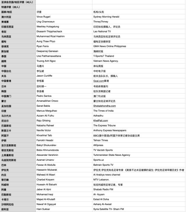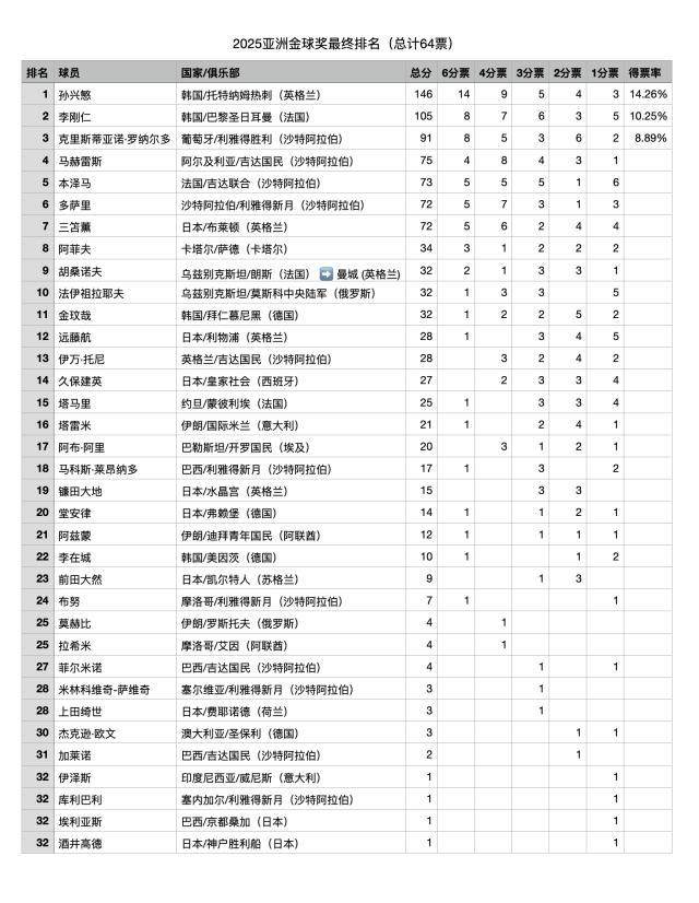 Sports Weekly 2025 Asian Golden Globe Awards Jury After nearly two months of preparation, voting, and statistics, the selection of Sports Weekly 2024 Asian Golden Globe Awards was successfully concluded in early October 2025. 42 judges representing 42 AFC member countries/regions and 22 specially invited international judges participated in the voting. South Korea national team and former Tottenham Hotspur captain, Son Heung-min ranked first with 146 points and won the 2025 Asian Ballon d'Or. Lee Gang-in, another star player in South Korea, ranked second with 105 points, and Portuguese star Cristiano Ronaldo, who played for Victory in Riyadh, Saudi Arabia, ranked third with 91 points. The following is the detailed ranking and list of judges for the Asian Golden Globe Awards. Note: The voting reference time range is from August 16, 2024 to July 16, 2025. Player information is based on this time range. Precise rule: The 1st place (first vote) to the 5th place (fifth vote) are 6 points, 4 points, 3 points, 2 points, 1 point respectively. If the total points are the same, the one with more votes in the 1st place will be ranked first. If the total score is still the same, the number of votes in the 2nd place will be considered, and so on. Selection scope: (1) Players who are eligible to compete for the AFC Football Association teams (2) Players who play in leagues under the AFC Football Association The following are the voting details of the 64 judges List of judges