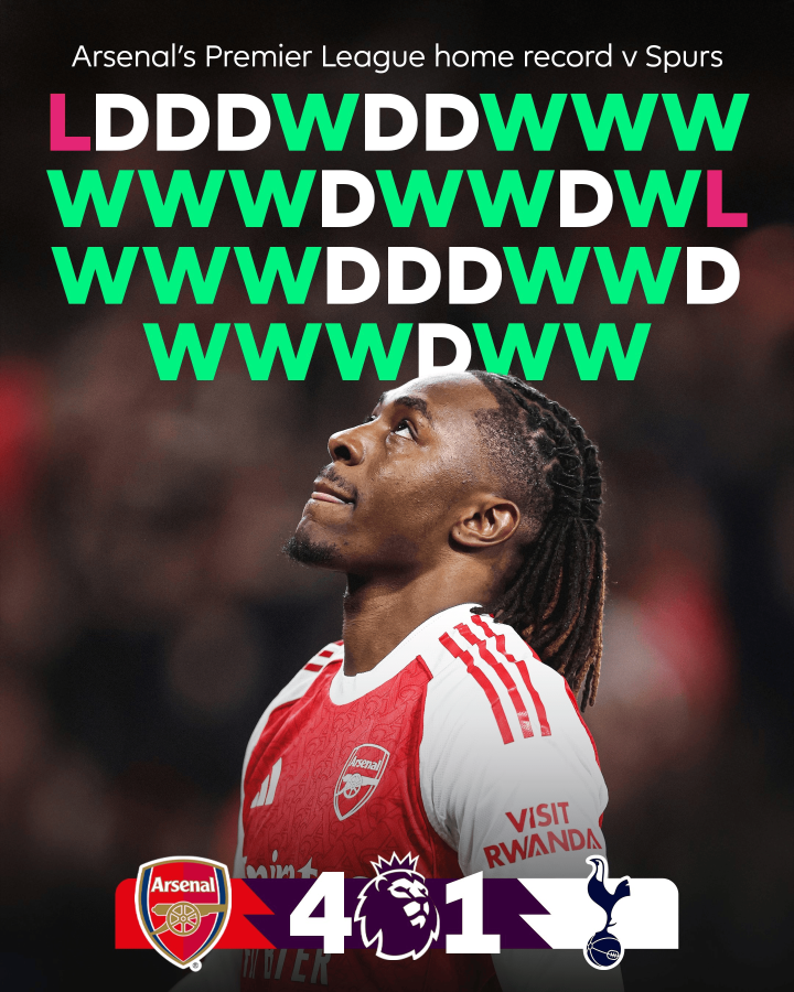Hupu News November 24th: In the 12th round of the Premier League, Arsenal defeated Tottenham 4-1 at home. The Premier League officially released a poster, counting Arsenal's home record against Tottenham Hotspur during the Premier League era. Data shows that Arsenal have only lost two North London derbies at home in the Premier League, one in the 1992-93 season and one in the 2010-11 season. In the game in November 2010, they led 2-0 at home and were eventually beaten by Tottenham. Nasri and Schamacher scored in that game, but goals from Bell, Van der Vaart and Kaboul helped Tottenham reverse the situation - Van der Vaart contributed 1 goal and 2 assists, becoming the biggest contributor to Tottenham's victory on the spot. Arsenal has won 5 of the last 6 North London derbies at home in the Premier League.