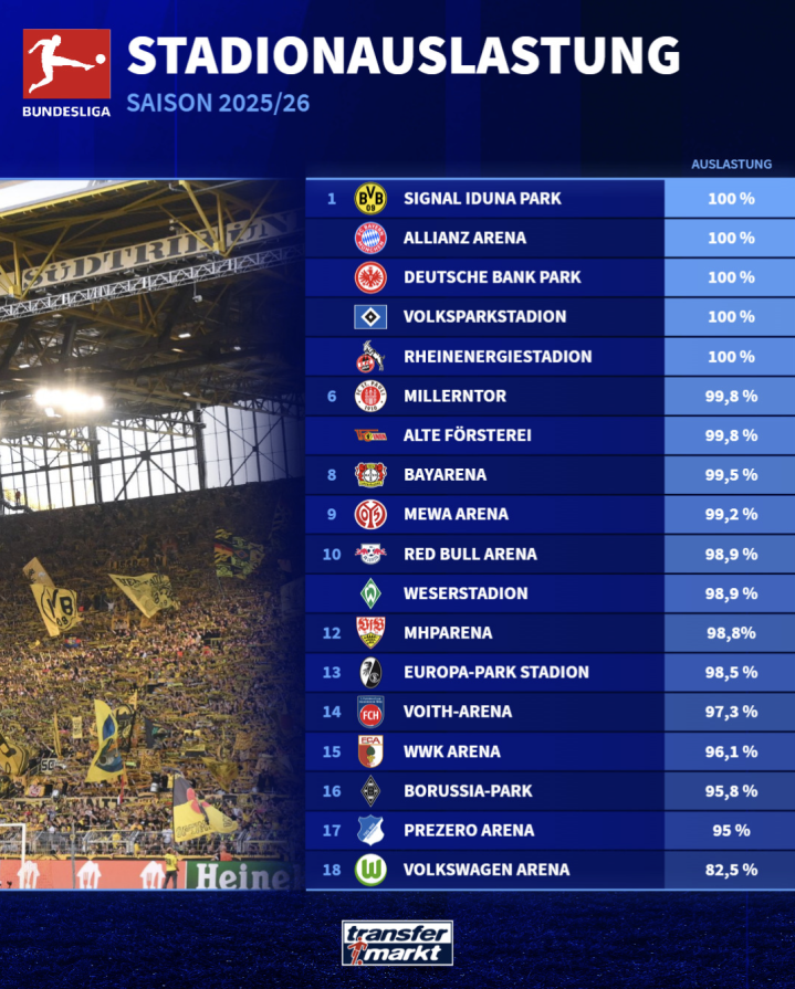 Bundesliga home attendance rate this season: Except for Wolfsburg, all other attendance rates are no less than 95%
