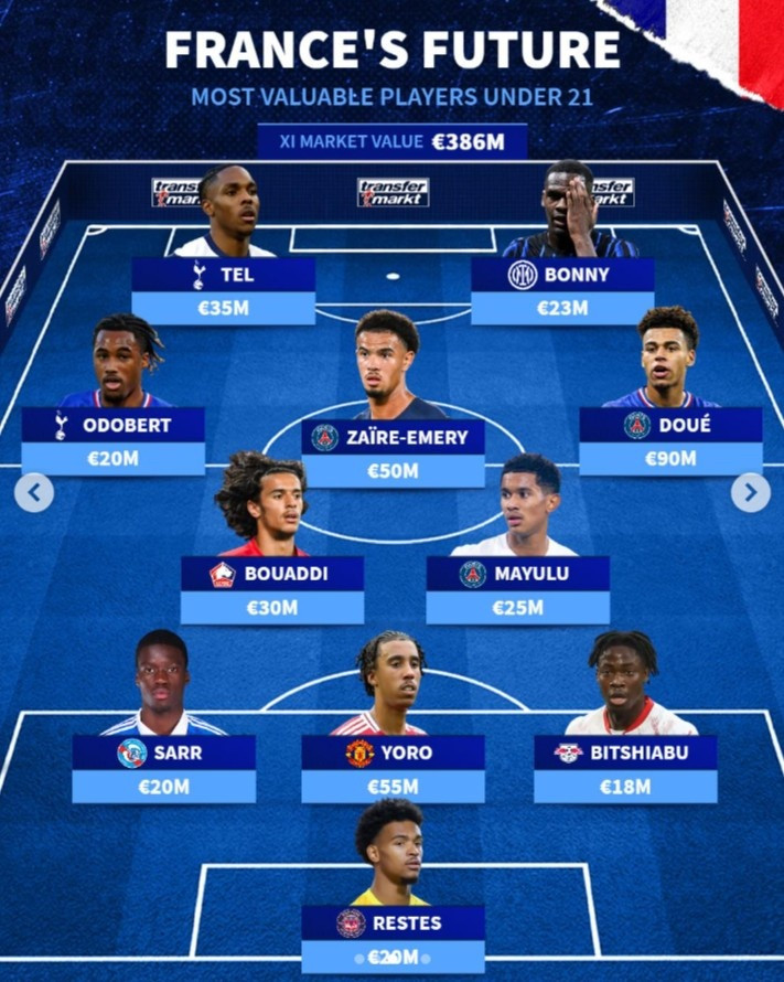 On October 12, Xunde listed the most expensive lineup of France U21. Douai has the highest price of 90 million euros. Yoro, Bony, and Ter are also listed. The total value of the team is 386 million euros. Attached is the most expensive lineup of France U21: Goalkeeper: Lester (Toulouse, 20 million euros) Defenders: Mamadou Sarr (Strasbourg, 20 million euros), Yoro (Manchester United, 55 million euros), Bischiab (Leipzig, 18 million euros) Midfielder: Bouadi (Lille, 30 million euros), Maioulou (Paris, 50 million euros), Odobel (Tottenham, 20 million euros), Zaire Emery (Paris, 50 million euros), Douai (Paris, 90 million euros) Forwards: Ter (Tottenham, 35 million euros), Bony (Inter Milan, 23 million euros)