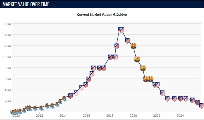 October 3rd news Germany and the La Liga player value was updated yesterday. The 34-year-old Griezmann's net worth continued to fall, with 12 million euros left. Born by 1991, Griezmann is now 34 years old, and his net worth is inevitable. So far this season, the players played 9 games for Atletico Madrid with only 2 goals, 7 games, 2 starts and 5 substitutes, and 2 starts and 2 starts in the Champions League. It is considered the main rotation force of Atletico Madrid. At his peak, Griezmann, as one of the core of the French team, helped the team win the World Cup championship. At the end of 2018, the 27-year-old grid reached its highest value of 150 million euros. Unfortunately, Griezmann's later experience of joining Barcelona was not a good one. He just missed two La Liga titles and has not won the league championship so far.