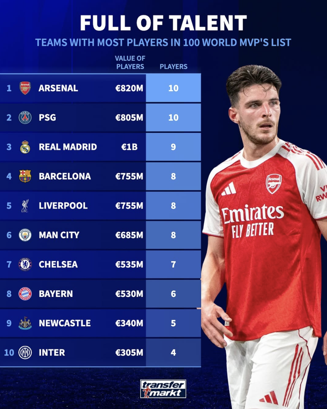 On October 22, Hupu Xundezhuan compiled a list of teams with the most players in the top 100 worth. Arsenal and Paris rank first and second with 10 players each. Although Real Madrid ranks third because it has 9 players, its players' total worth of 1 billion euros ranks first. The following is the complete list: 1. Arsenal: 10 people with a total of 820 million euros 2. Paris: 10 people with a total of 805 million euros 3. Real Madrid: 9 people with a total of 1 billion euros 4. Barcelona: 8 people with a total of 755 million euros 5. Liverpool: 8 A total of 755 million euros 6. Manchester City: 8 players totaling 685 million euros 7. Chelsea: 7 players totaling 535 million euros 8. Bayern: 6 players totaling 530 million euros 9. Newcastle United: 5 players totaling 340 million euros 10. Inter Milan: 4 players totaling 305 million euros