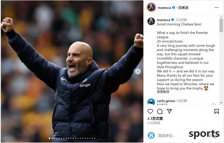 In May 26, in the last round of the Premier League, Chelsea played 1-0 Nottingham Forest away, and finally ranked fourth in the Premier League and qualified for the Champions League. Chelsea coach Maresca posted several photos and wrote: "Good morning, Chelsea fans! What a great way we ended the Premier League this season. 20 wins/20 photos. It's a very long journey, some difficult and challenging moments along the way, but the team has shown amazing resilience, unique solidarity and always believed in our style of play. We did it - and did it the way we did it. Thank you very much for all the fans for their support throughout the season. Now we will head to Wroclaw (European Union Final location) and hope to bring trophys for everyone."