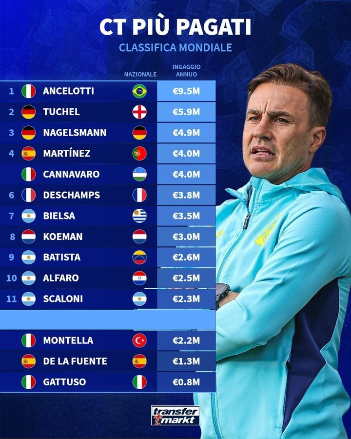 October 9th According to statistics from the German "Transfer Market" website, the following is the ranking of the national team (region) head coaches with the highest annual salary in world football. Ancelotti (Italy) → Coaching Brazil: 9.5 million euros Tuchel (Germany) → Coaching England: 5.9 million euros Nagelsmann (Germany) → Coaching Germany: 4.9 million euros Martinez (Spain) → Coaching Portugal: 4 million euros Cannavaro (Italy) → Coaching Uzbekistan: 4 million euros Deschamps (France) → Coaching France: 3.8 million euros Bielsa (Argentina) → Coaching Uruguay: 3.5 million euros Koeman (Netherlands) → Coaching the Netherlands: 3 million euros Batista (Argentina) → Coaching Venezuela: 2.6 million euros Alfaro (Argentina) → Coaching Paraguay: 2.5 million euros Scaloni (Argentina) → Coaching Argentina: €2.3 million Montella (Italy) → Coaching Turkey: €2.2 million De La Fuente (Spain) → Coaching Spain: €1.3 million Gattuso (Italy) → Coaching Poland: €800,000