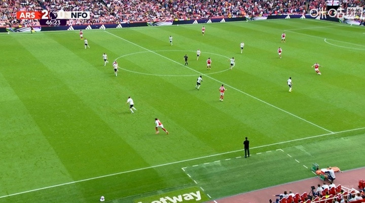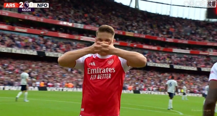 September 13th, the fourth round of the Premier League, Arsenal vs. Nottingham Forest. In the 46th minute of the game, Yorke received an assist from Eze and scored his third goal of the season! Arsenal led 2-0.