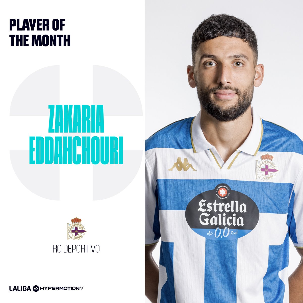 Hupu, October 4th, officially announced that La Coruna striker Zakaria Edahori was awarded the Player of the Month in the Spanish Second Division in September 2025. The Dutch center performed well in September, scoring 4 goals, becoming a key figure under Antonio Hidalgo, helping the team achieve an unbeaten record of 3 wins and 2 draws that month and continue to lead the standings. Edajori's most eye-catching performance appeared in the away game against Milandes. He made a substitute in the 71st minute, scoring the team's third goal in just one minute, and then scored again in the 80th and 88th minutes, staged a "hat trick" completed within 16 minutes, leading the team to a key victory. In the next game, he scored another goal against Huesca at Riaso Stadium, continuing his hot form.