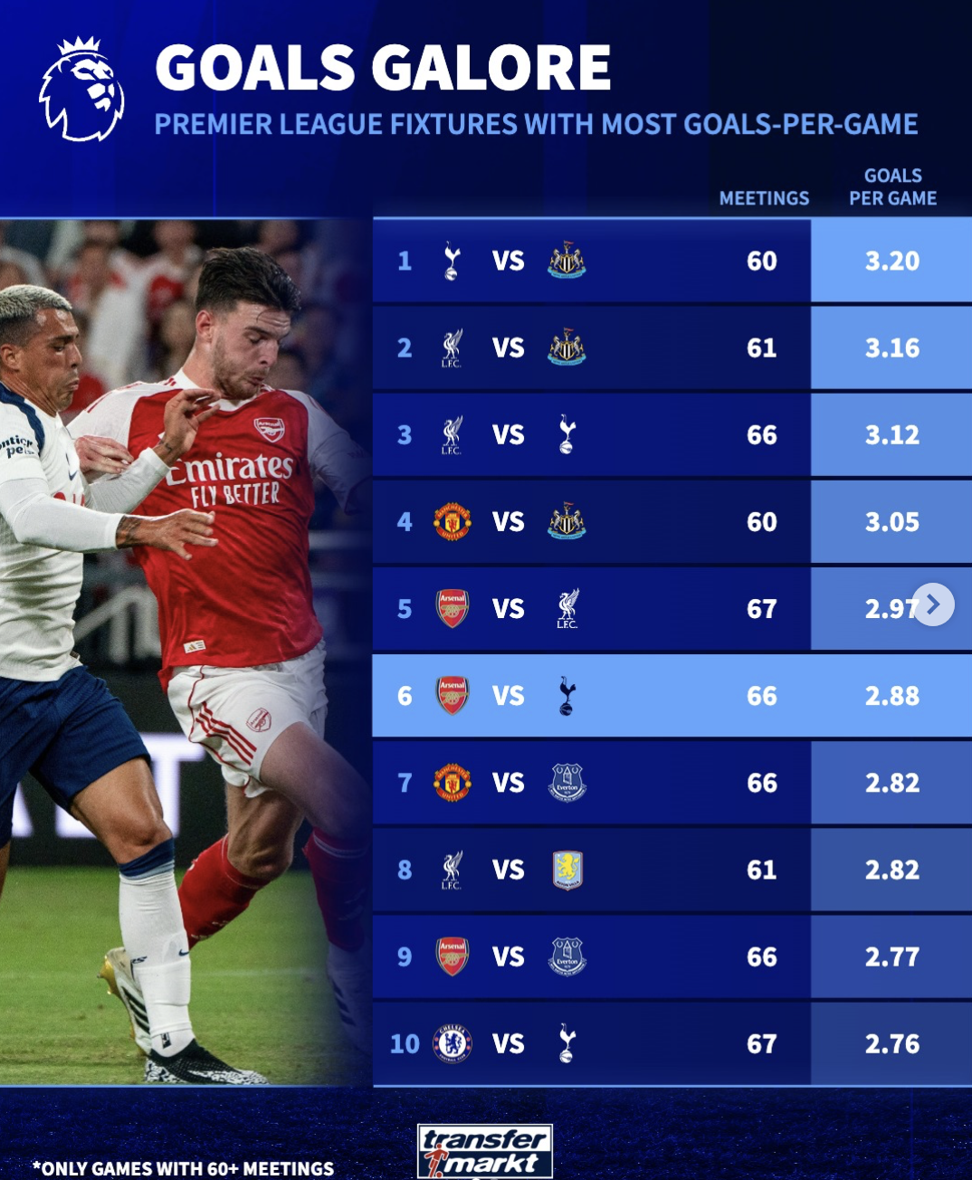 Premier League match-up average goals: Tottenham vs. Newcastle tops; Arsenal vs. Tottenham ranks sixth