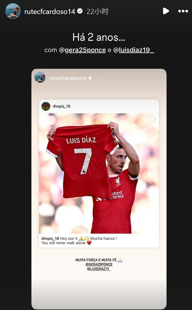 October 30th: Liverpool forward Jota passed away in a car accident this summer. His widow Root posted old photos on social media yesterday to commemorate her.  Rutte forwarded a photo of Jota holding up Dias' No. 7 jersey in support of the latter two years ago. She couldn't help but sigh: "2 years ago..."  Not long before that photo was taken, at the end of October 2023, Luis Dias's parents were kidnapped in their native Colombia. To show his support, Jota raised the shirt of his teammate and friend after scoring Liverpool's first goal in the league against Nottingham on October 29 (3-0).  After the game, Jota also posted this photo on his social media account. Nearly two weeks after this show of solidarity, Diaz's father, Luis Manuel, was finally released, while his mother, Silenice, had been released days earlier.  On the second anniversary of this incident, Rutte, Jota's widow and mother of three children, now recalled that beautiful moment to her fans on social media. She also liked Díaz (7.2 million followers) and his wife Guerra Ponce (794,000 followers), and Guerra Ponce also retweeted the post through social media.