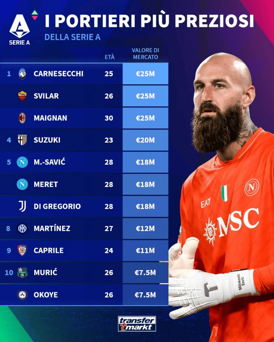 Hupu News on October 9th: The German transfer market has calculated the worth of Serie A goalkeepers. The details are as follows: 1. Carnesechi (Atalanta, 25 years old): 25 million euros Sveral (Roma, 26 years old): 25 million euros Maignan (AC Milan, 30 years old): 25 million euros 4. Aya Suzuki (Parma, 23 years old): 20 million euros 5. Milinkovic-Savic (Naples, 28 years old): 1 8 million euros Meret (Naples, 28 years old): 18 million euros Di Gregorio (Juventus, 28 years old): 18 million euros 8. Josep Martinez (Inter Milan, 27 years old): 12 Million euros 9. Caprile (Cagliari, 24 years old): 11 million euros 10. Muric (Sassuolo, 26 years old): 7.5 million euros Okoye (Udinese, 26 years old): 7.5 million euros