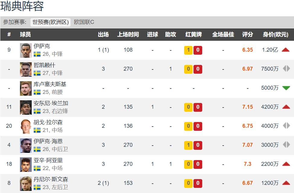The Swedish national team is really a magical team. The team has many main players from the Premier League and Champions League teams, but the overall strength of the team is very low. It can only be said that the coaching staff is incompetent. The tactical and business capabilities are too poor to unite the players' abilities. It is in vain to have the two Premier League strikers Isaac and Jokeres. In the early morning of October 11, Sweden ushered in the third round of Group B of the European Group Stage of the World Cup preliminaries. As a result, Switzerland lost 0-2 at home to Switzerland. They were winless in 3 rounds of World Cup preliminaries, with 1 draw and 2 losses and 1 point, finishing at the bottom of the group. Sweden 0-2 Switzerland, Sweden's starter is worth 311 million euros, while Switzerland's starter is worth 154 million euros. It is a bit unreasonable to have twice the opponent's worth, but they were zero-blocked and scored 2 goals. They were still playing at home. Sweden's record in the first three rounds of World Cup qualifying is as follows: 2-2 Slovenia away, 0-2 Kosovo away, and 0-2 Switzerland at home. Sweden was originally the strongest team in this group, but it was difficult to win in the first three rounds, and the qualifying situation has become precarious. The Swedish team is also full of stars, including Liverpool forward Isaac, Arsenal forward Jokeres, Tottenham offensive midfielder Kulusevski, Newcastle winger Ilanga, Frankfurt midfielder Larsson, Atlanta defender Sheehan, Brighton midfielder Ayari, and Dortmund defender Svensson. Many of the above-mentioned players play for the Premier League and Champions League teams and are the main players. The remaining players are also the main players of the major teams in the five major leagues. However, the Swedish national team's combat effectiveness is so low, which shows that coach Thomasson's ability is too poor. This rookie coach who has never coached even in the five major leagues has really delayed such a good lineup in Sweden.