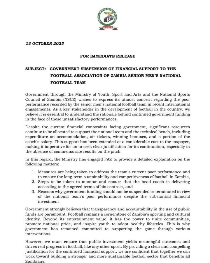 The national team performed poorly, and the Zambian government suspended financial support: it must be responsible to taxpayers
