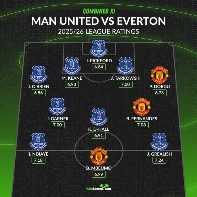 November 25th: Manchester United faced Everton in this round of the Premier League. The data agency whoscored also listed the best team of the two teams based on the average rating of the Premier League this season. Manchester United only had 3 players shortlisted. whoscored column Everton Manchester United rating combined lineup: Goalkeeper: Jordan Pickford (Everton, 6.64 points) Defenders: Jack O'Brien (Everton, 6.56 points), Michael Keane (Everton, 6.93 points), James Tarkovsky (Everton, 7.00 points), Patrick Dolgu (Manchester United, 6.73 points) ) Midfielder: James Garner (Everton, 7.00 points), Kiernan Dewsbury Hall (Everton, 6.91 points), Bruno Fernandez (Manchester United, 7.08) Points) Forwards: Iliman Ndiaye (Everton, 7.18 points), Brian Mbemo (Manchester United, 6.99 points), Jack Grealish (Everton, 7.24 points)